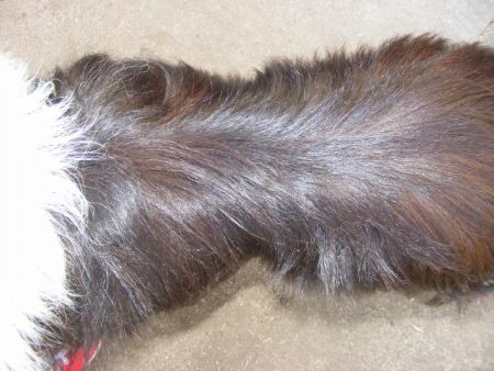 One of our very sad cases is dear Mandy. She was a stray in the pound and never reclaimed by her owners, which is not surprising as Mandy had obviously been subjected to abuse in her previous “home”. Mandy had a dreadful wound on her back/rump area, which looked very much like she had been hit by a shovel. It was quite long and very deep, but luckily did not become infected thanks to the pound ranger’s attention. The wound has healed over time but hair will never grow in that area again.